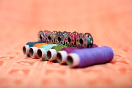 Picture of colored thread with bobbin on the orange cloth.