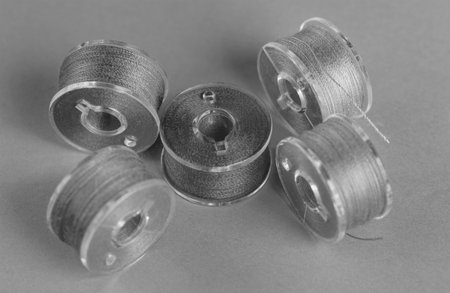 Sewing threads on bobbins. On a black and white background. Place for text.