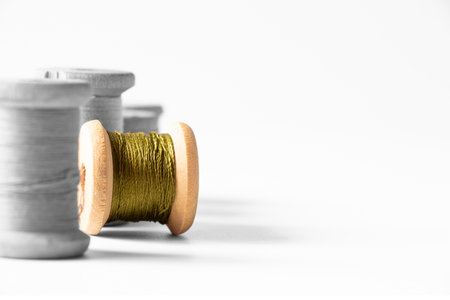 Colored sewing thread coils on white background with copy space for text