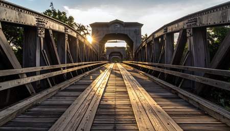 A long wooden railway bridge with metal supports and an arched entrance is bathed in the warm glow of a sunburst.