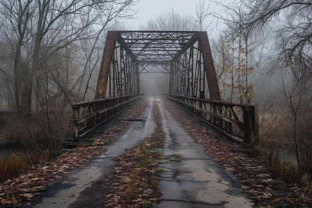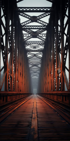 an old, abandoned railroad bridge stands prominently in the foreground of this photo. the bridge showcases a captivating blend of dark bronze and red hues, creating a visually striking contrast. the composition follows a dynamic symmetry, while the misty atmosphere adds an air of mystery. the photo employs photo-realistic techniques, capturing intricate details with precision. the bridge's technological symmetry is highlighted, making it a captivating
