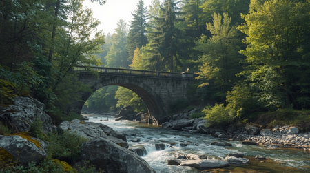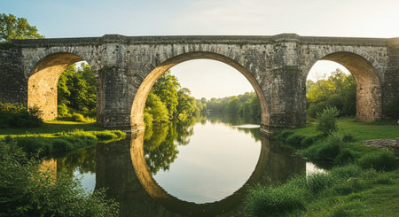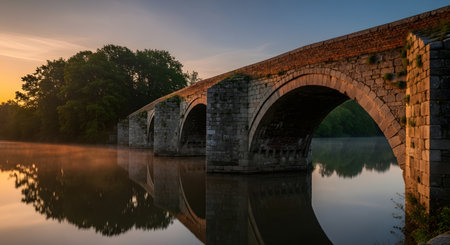 Old stone bridge arches over calm river at sunrise with serene reflections in still water. Scenic landscape with nature and structural architecture. AI Generative AI generated