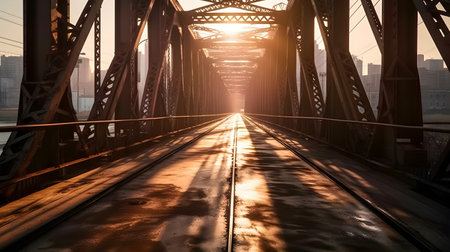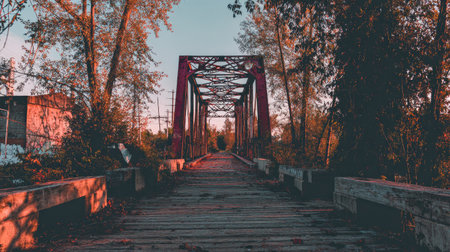 Twilight bathes an old bridge in a tranquil glow, highlighting the wooden tracks and steel frame against a mountainous backdrop. The bridge stands as a serene passage in the quiet of evening. AI generation AI generation