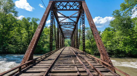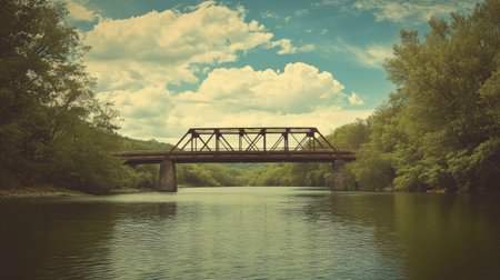 A scenic view of a rustic steel bridge spanning a rushing river, surrounded by lush greenery and vibrant blue skies. Perfect for nature and landscape themes.