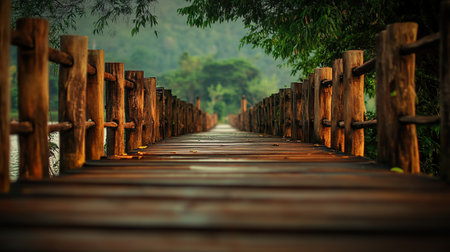 A rustic wooden bridge stretches over calm water, surrounded by a misty landscape. This serene scene captures the beauty of nature and tranquility, perfect for travels and exploration themes.