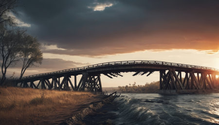 The remnants of a once-sturdy bridge are cast in a haunting light by the twilight sky, reflecting the powerful forces of nature and time. The wild river below underscores the bridges fragility and the passage of eras. AI generation AI generation