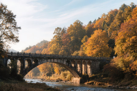 Stone arch bridge over tranquil water in autumn forest landscape generated by artificial intelligence