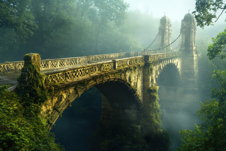 A beautiful old stone bridge is enveloped in mist, set in a serene forest landscape during early morning hours.