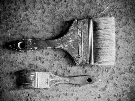 Paintbrushes on metal surface. Old brush set for house maintenance. Technical background with copy space
