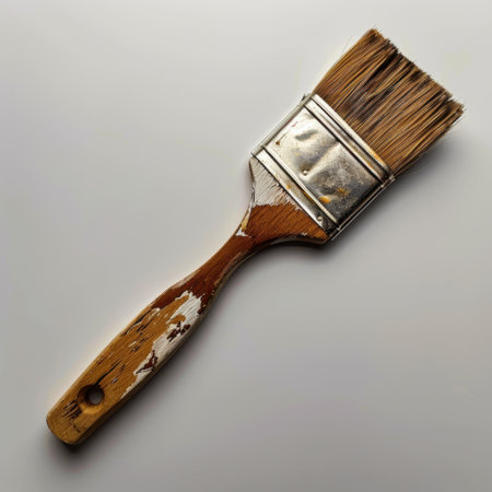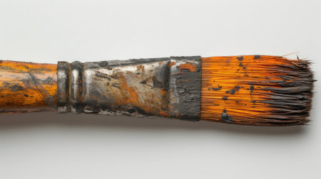 Capture the essence of creativity with this detailed image of a used paint brush featuring a wooden handle and frayed bristles, ideal for artistic projects.