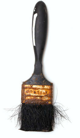 Close up view of old rusty painting brush with grey background. Paint texture peeling off from brush handle.