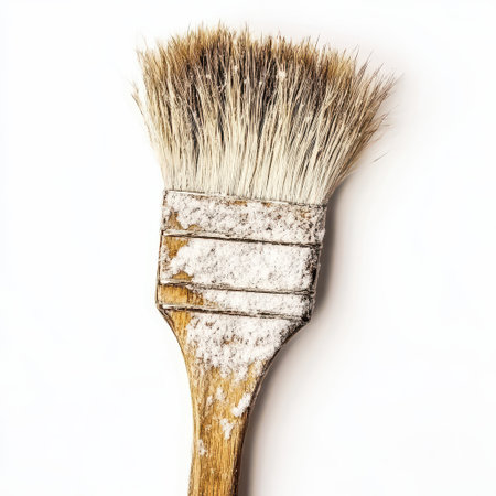 A brush with a wooden handle shows white powder residue on its bristles indicating use in painting or crafting activities.