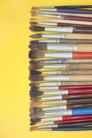 Set of random brushes for painting on yellow background. The concept of creativity, art. Copy space. Selective focus.