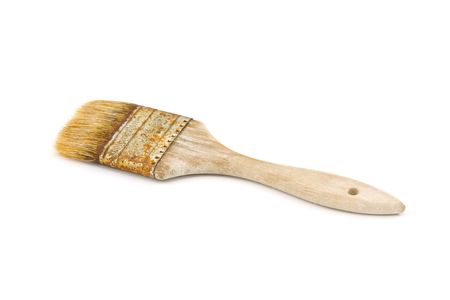 This image showcases a close-up view of a weathered paint brush with a chipped handle and faded bristles, perfect for projects, renovations, or artistic visuals.