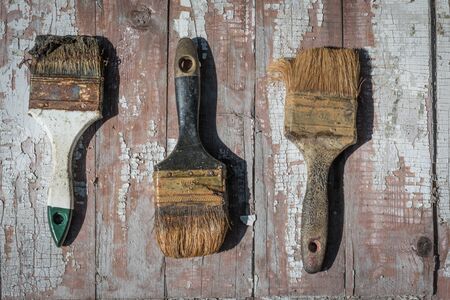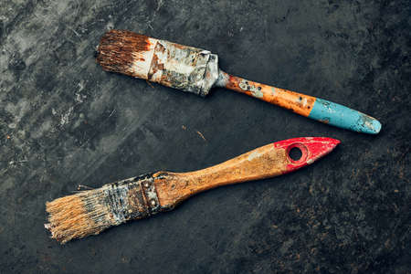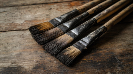 Close-up of well-used paint brushes with dried paint on bristles, lying on a rustic wooden table
