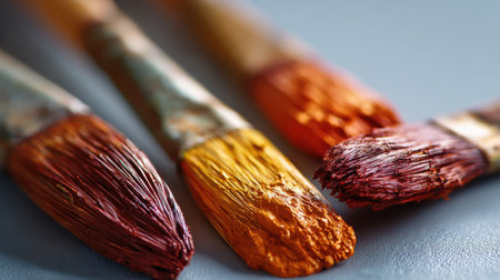 This close-up image features three paintbrushes with vivid colors of orange, yellow, and red paint on their bristles, highlighting creativity and artistry.