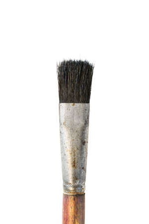 Old paintbrush with wooden handle, close-up view. Artistic tool concept