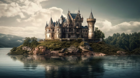 A castle sitting on top of a lush green hillside. Generative AI image.