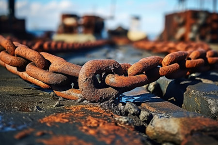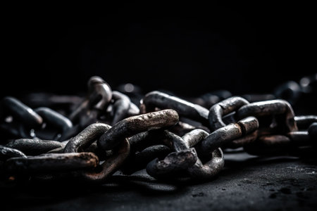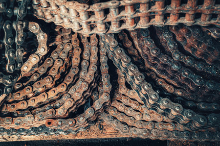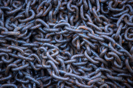Weathered chain links display intricate textures and rust, highlighting their industrial use and age.