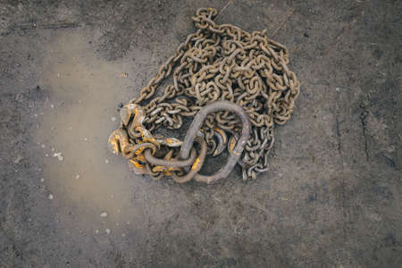 Closeup of a harbor s rusted thick anchor chain lying on the ground