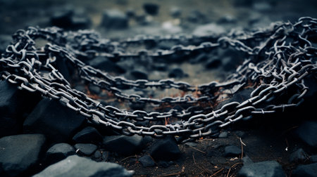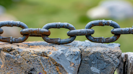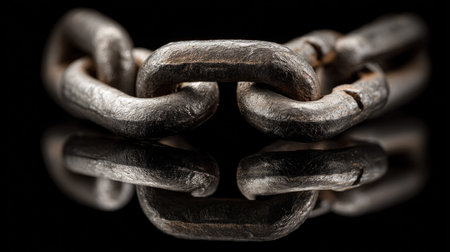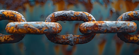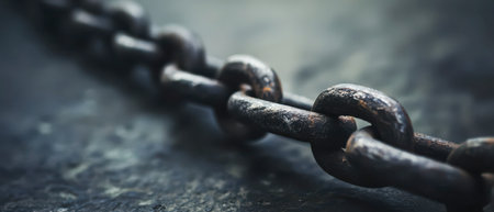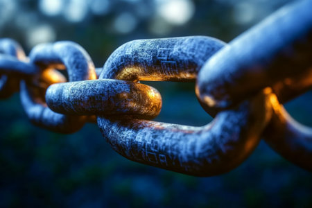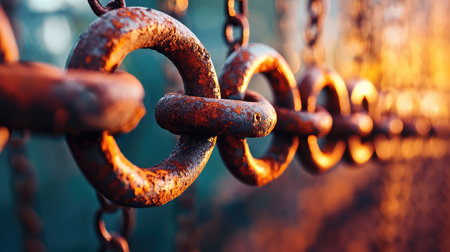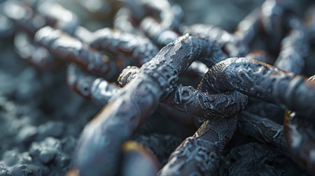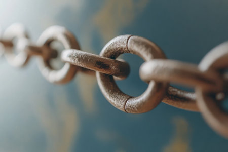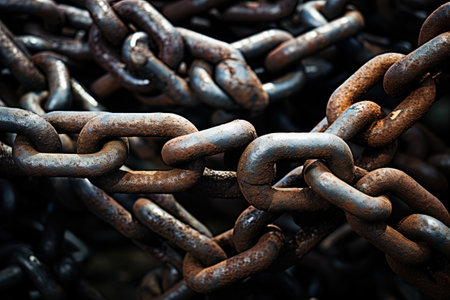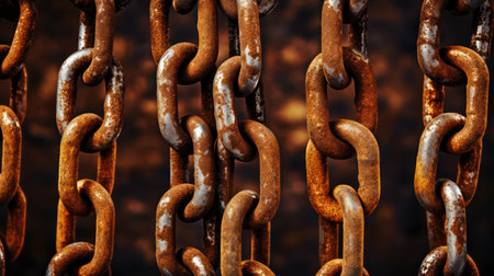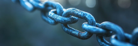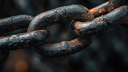 Macro shot of interconnected metal chain links with intricate textures, symbolizing strength, connection, and security.