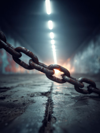 A rusty chain rests on the ground under dim lights in an industrial hallway. Graffiti decorates the walls, creating an urban atmosphere at twilight.