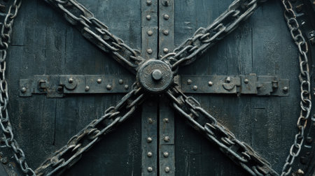 Close-up view of an ancient rustic door secured with heavy chains and intricate metal fasteners, ideal for themes related to history and architecture.