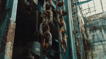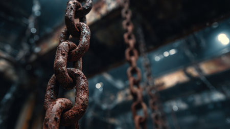 Rusty chains hang in dimly lit environment, showcasing their weathered texture and intricate links. atmosphere evokes sense of mystery and history, drawing attention to aged metal