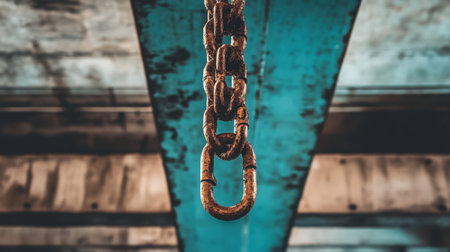 A close-up image of a rusty metal chain hanging from an industrial ceiling, featuring a striking blue and gray background. This composition captures the essence of strength and texture in an urban environment.