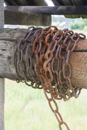 Pattern of thick rusty chain hang on wooden rail.