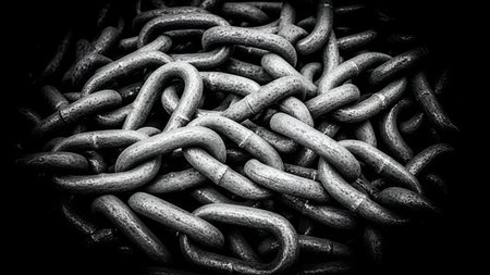 A close-up of a chain link, showing a black and rusty surface, symbolizing strength and the passage of time.