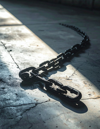 A heavy, dark metal chain rests on a cracked concrete floor, dramatically illuminated by a single beam of light.