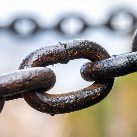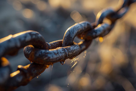 A macro shot capturing a single chain link glistening with dew against a soft bokeh background, highlighting themes of connection and strength