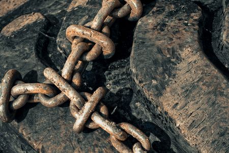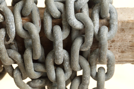 Old rusty ship anchor chain links close up.