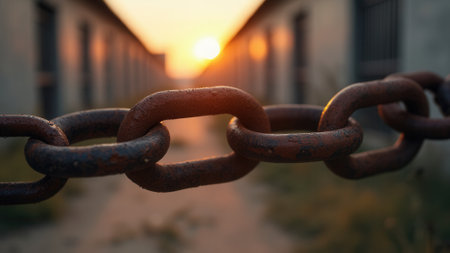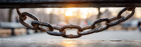 Macro view of an aged, corroded chain link stretching across an alleyway with the sun setting, casting a warm glow on old industrial-style buildings in the background.