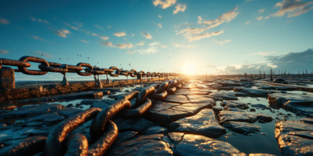 abandoned and destroyed area with large long chains lying on the ground and stretching towards the horizon, ship chains in a dried marina