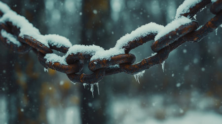 This close-up image showcases a rusty metal chain link adorned with snow, set against a blurred winter forest backdrop, evoking a serene atmosphere.