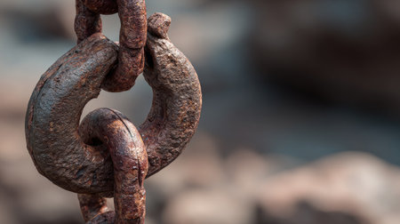 Close-up of a rusty chain link showcasing its textured surface in an outdoor environment. This image symbolizes strength and resilience with a vintage appeal.