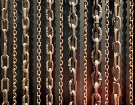Close up of aged grimy and corroded steel hoist chains varying sizes