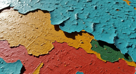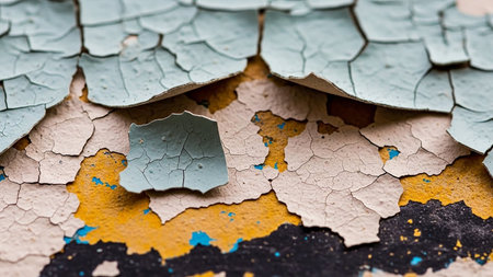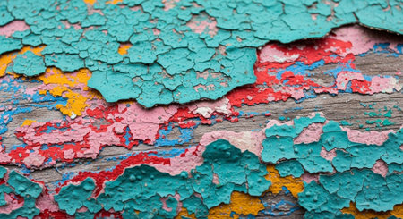 Abstract close-up of weathered paint layers on textured surface