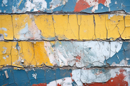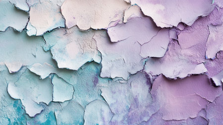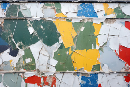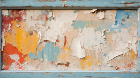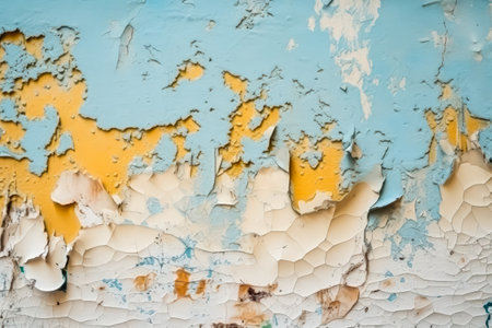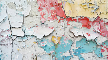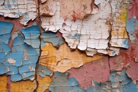 Aged wall with colorful peeling pieces of paint. Abstract wallpaper background. Created with Generative AI