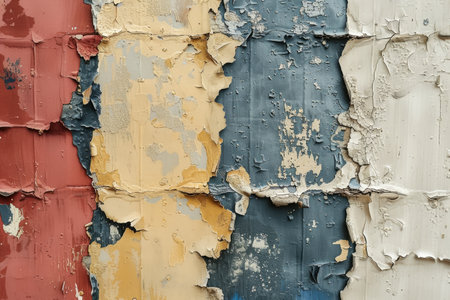 Layers of peeling paint reveal an old textured wall showcasing colors and deterioration in a rustic environment.