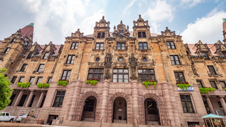 Albany, NY - USA - May 22, 2021: A view of the historic Richardsonian Romanesque Albany City Hall, the seat of government of the city of Albany, New York. Featuring a 202-foot tall tower.