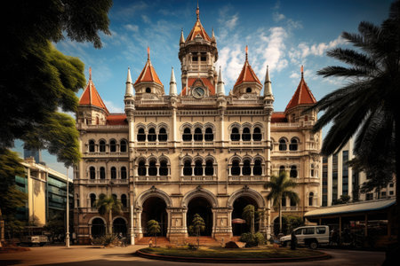 GeorgetownPenang/Malaysia - Feb 15 2020: Detail of architecture City Hall with Malaysia and Penang flag waving.