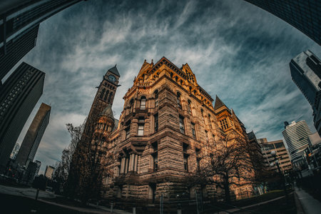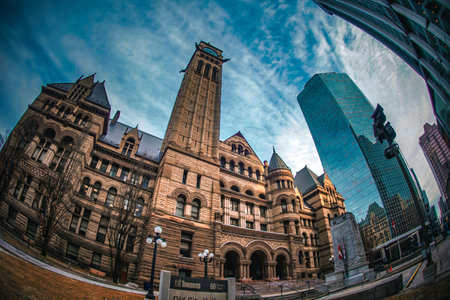 Old city hall of toronto in neo-gothic style near a modern skyscraper under the sunset light