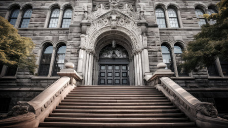 Ornate architectural entrance of historic building with detailed arch in evening light.