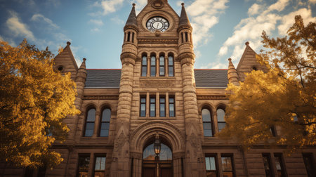 Vintage European Architecture with Tower and Ornate Windows Surrounded by Fall Leaves