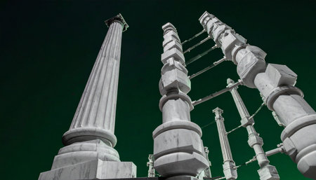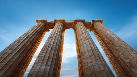 Stunning view of towering ancient columns reaching towards a bright blue sky. This impressive architectural feature captures the essence of timeless history and artistry.
