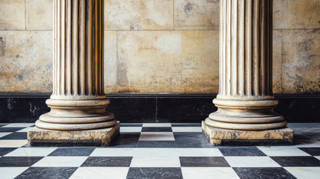 Two ornate columns stand on a checkerboard floor in a grand hall showcasing classical design elements and rich historical detail.
