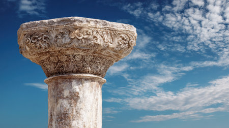 A close-up view of an ancient Roman column capital showcasing intricate designs against a clear blue sky filled with soft clouds, representing historical architecture.